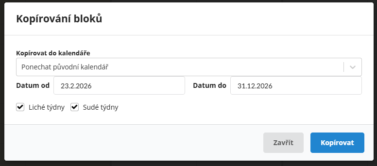 - V nastavení kopírování je už automaticky vybráno “Ponechat původní kalendář” a “Datum od” je automaticky následující pondělí.