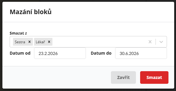 - Smažte následující týdny. (Pokud jste například upravili týden 16-22., dejte “Datum od” 23.2.2026 a “Datum do” termín, do kdy byla původně nastavena ordinační doba.)