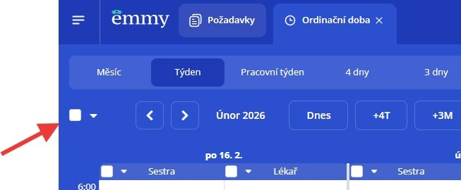 - Vlevo nahoře zaklikněte políčko, kterým označíte všechny bloky ordinační doby v tomto týdnu.